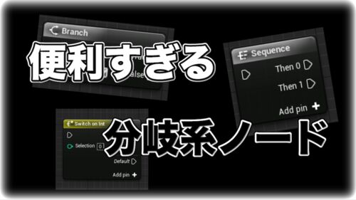 今回は場合によって出力先を変更するという便利なノードを紹介していこうと思います 必ず制作等で役に立つので必ず覚えていってください 今回は全部で3種類紹介したいと思います 【Branch】 【Sequence】 【Switch on Int】 一つ目に紹介するのは 【Branch…